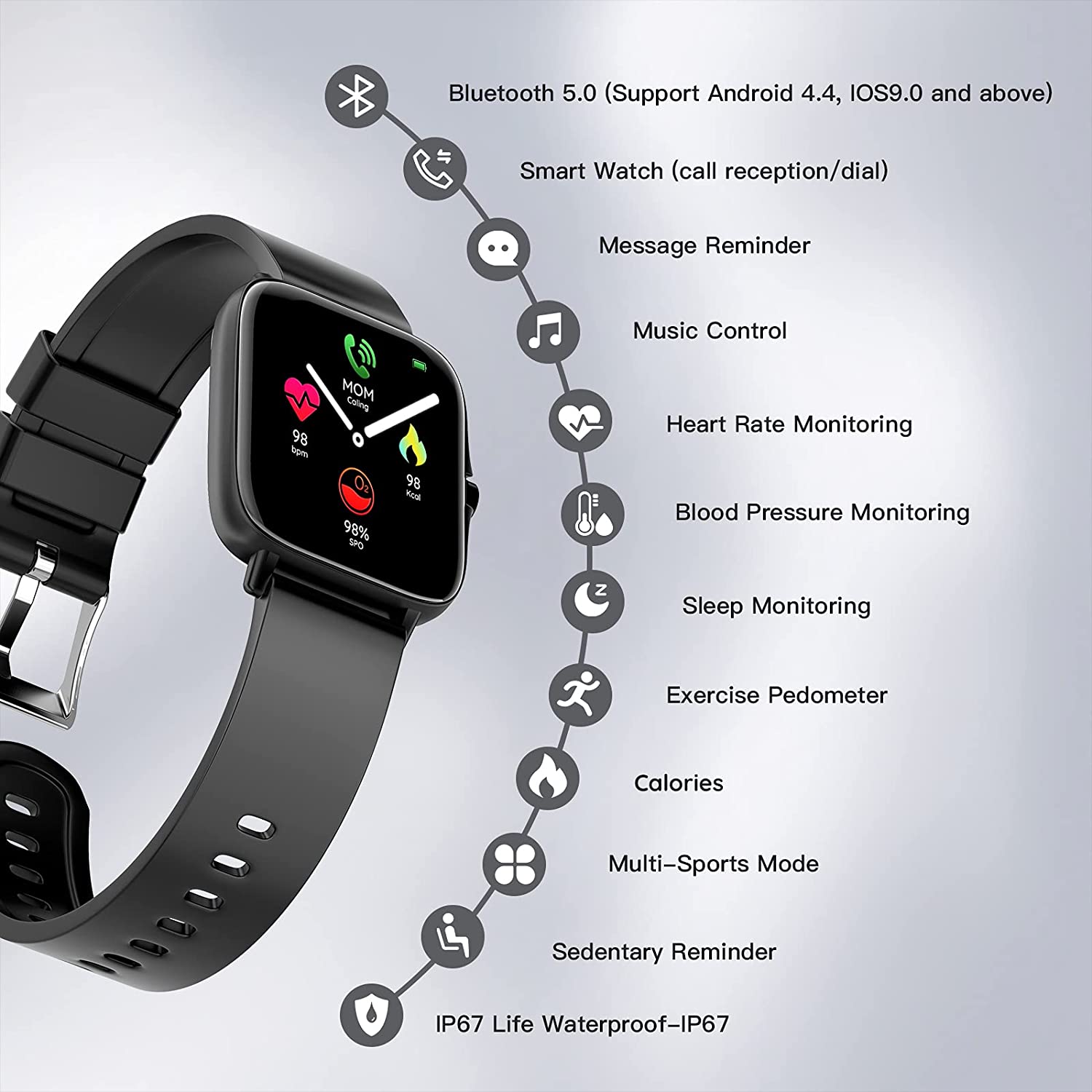 A When the smart watch is synchronized with the smart phone, you can receive and make calls, receive and view SMS and SNS messages, including Facebook, Twitter, WhatsApp, Linkedin, Messenger, etc., email, but you cannot send text messages with the watch.