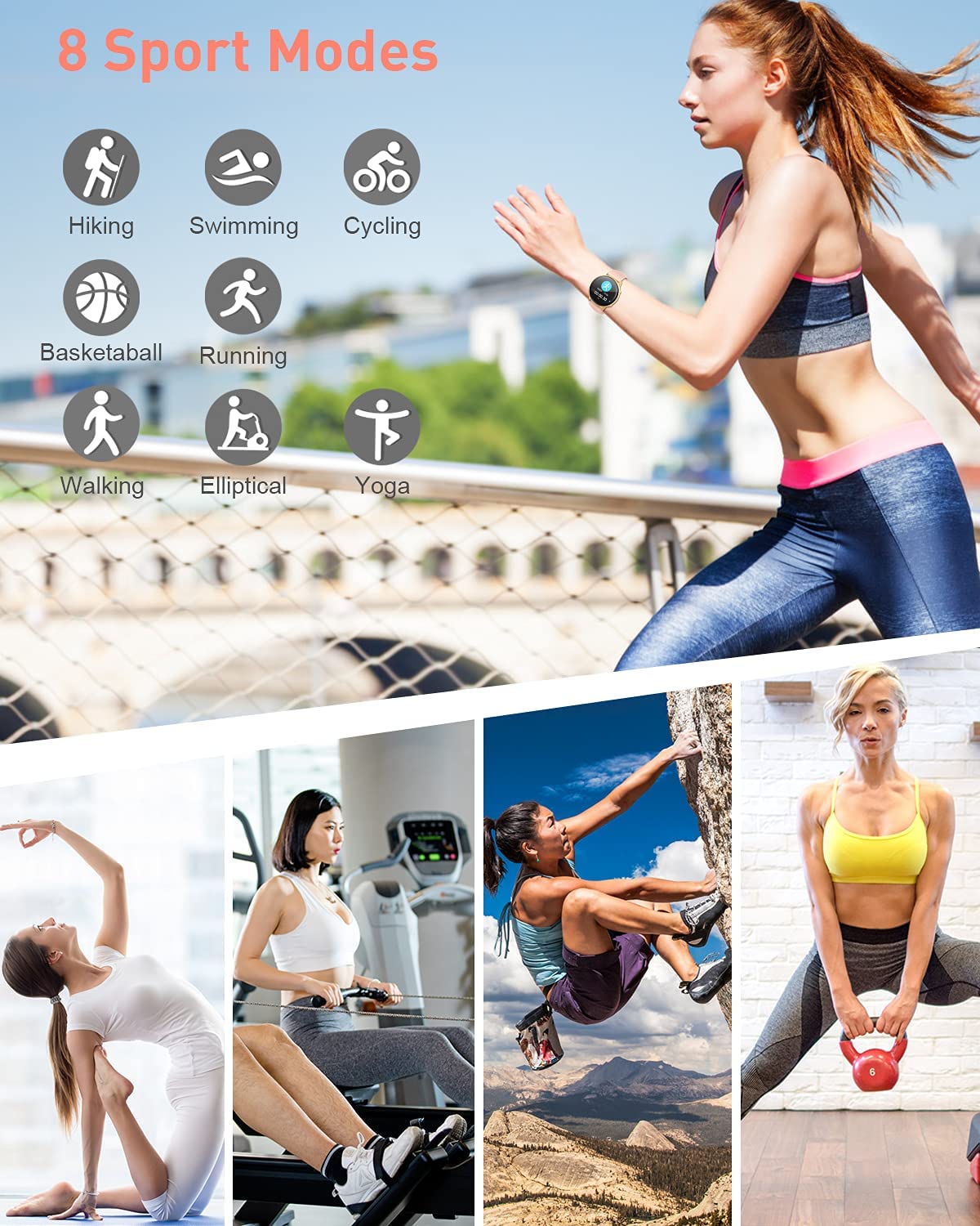 • гЂђFitness TrackingгЂ‘The fit watches for women can track your steps, walking distance and calories burned throughout the day. You can set a step goal. The watch also has 8 exercise modes to track your various exercise data and view the results of each exercise.
