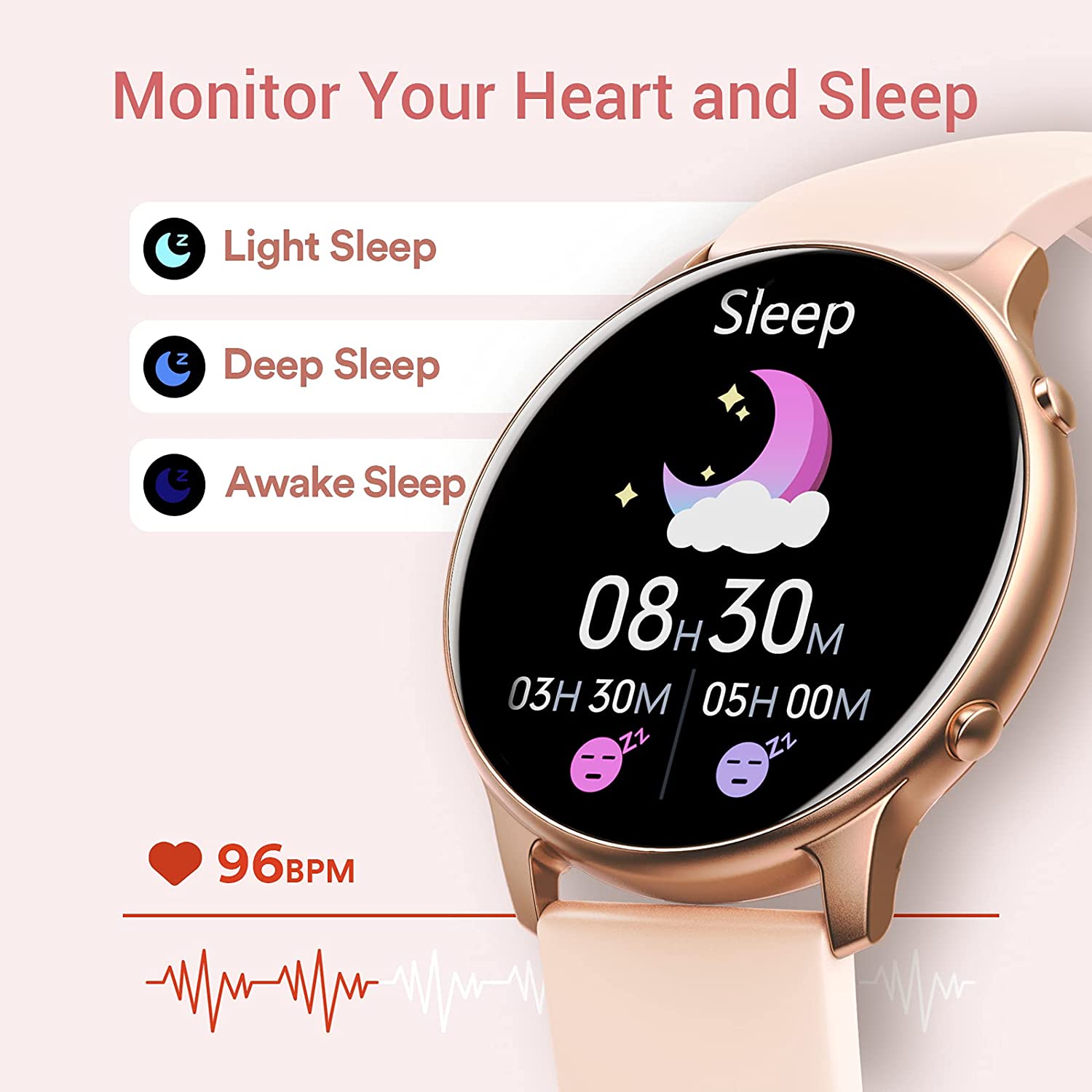 • All-day Activity Tracking: Detect your heart rate in real-time, and view daily, weekly and monthly breakdowns via our app. Our fitness tracker can also auto-track your sleep, and analyze your sleep quality.